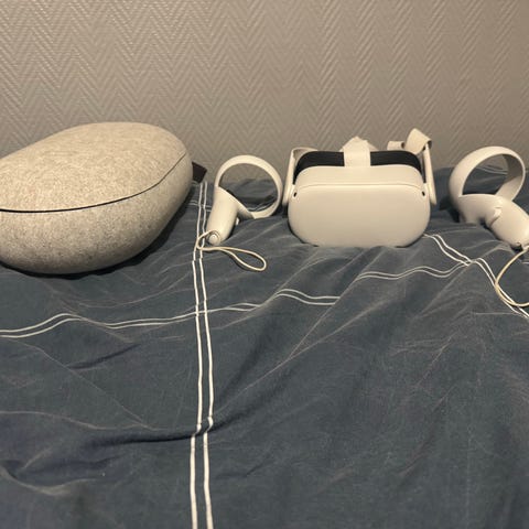 Oculus Quest 2 VR-headset med tilhørende controllere i hvid farve. Headsettet har justerbare stropper og indvendige linser til virtuel virkelighedsoplevelse.
