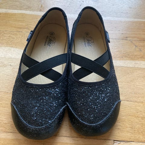 NY ubrugt Petit by Sofie Schnoor Baby and Kids MelaSK Indoor shoe. Pige ballerinasko/hjemmesko i størrelse 29. Skoene har en metallisk finish i peach farve og elastiske krydsremme over vristen for bedre pasform.