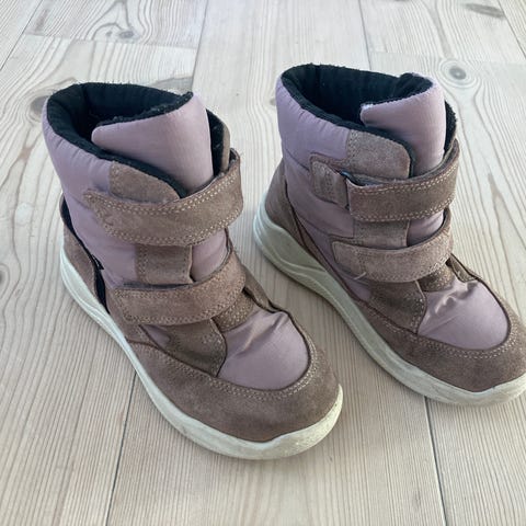 Lækker lilla vinterstøvle i ruskind og tekstil. Velcro-lukning over vristen. Foret med blødt, imiteret pels.Med Goretex-membran, som isolerer støvlen og holder fødderne tørre og lader dem ånde.