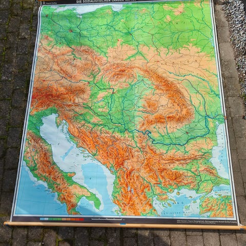 Kina skolekort med dimensionerne 214x160 cm. Kortet viser topografiske detaljer med farvekodning for højde og terræn.