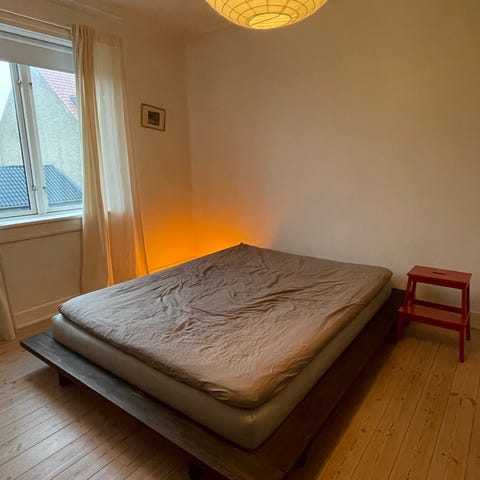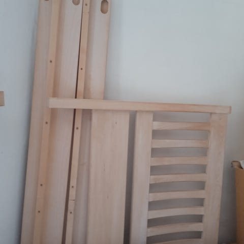 Sengerammen er købt brugt og har brugstegn. Der er knækket noget træ af på bagsiden, men det er ikke noget jeg har bemærket i den tid jeg har sovet på den. Den er købt sådan af mig.