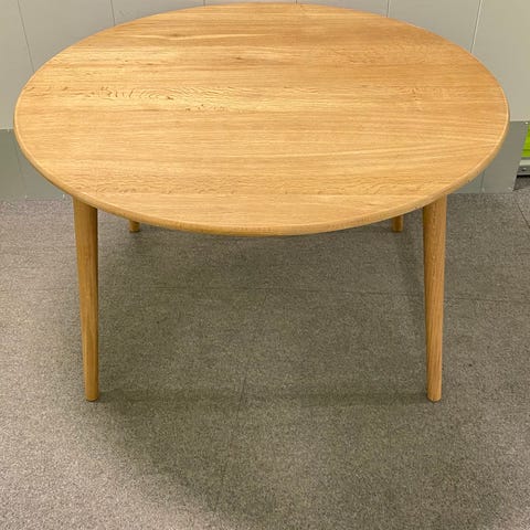Lækker rundt spisebord i massiv egetræ med udtræk, to tillægsplader massiv eg. H. 73 cm. Tillægsplader 50 cm. Spisebord med plader totallængde 210 cm. Fremstår i super stand. Evt kan lev aftales