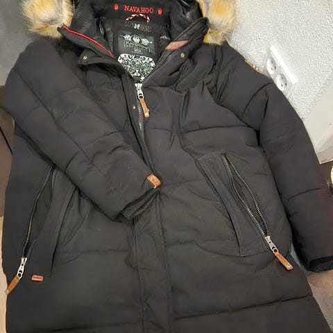 Dejlig varm vinterjakke med massere af pels, i størrelse L.