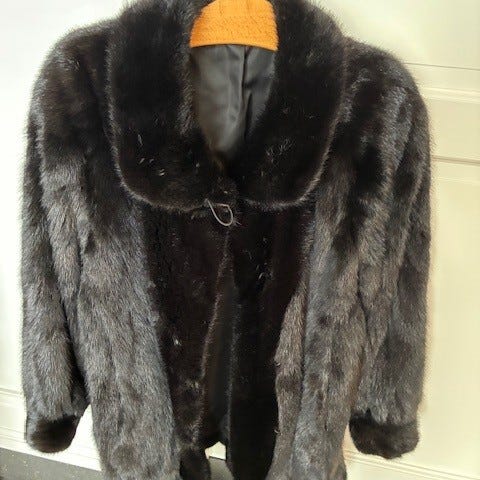 Frakken er lavet af ruskind og ægte mink pels, lukkes med fire knapper og har to lommer.