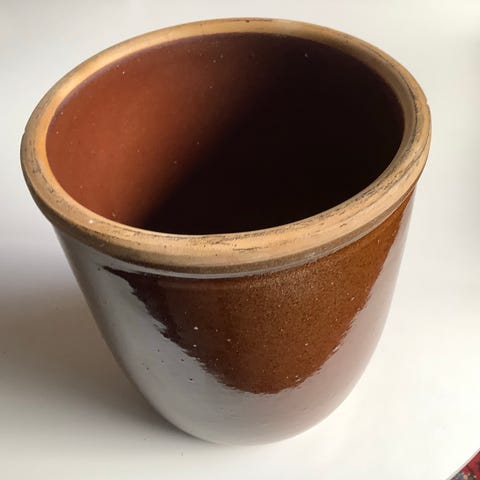 Gammel mørkebrun lerkrukke.