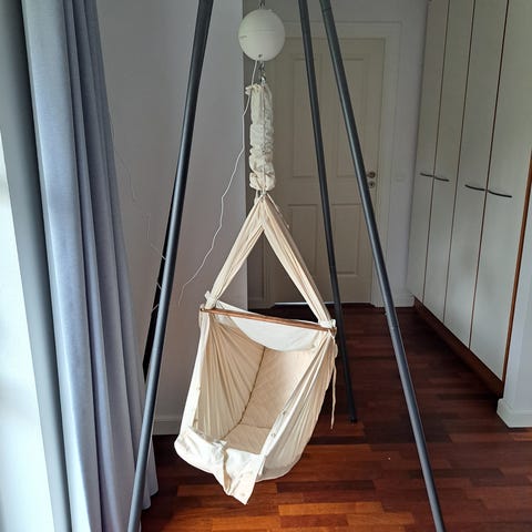 Slyngevugge fra Moonboon inkl. motor, stativ og karmbeslag. Rigtig fin stand - passet godt på.