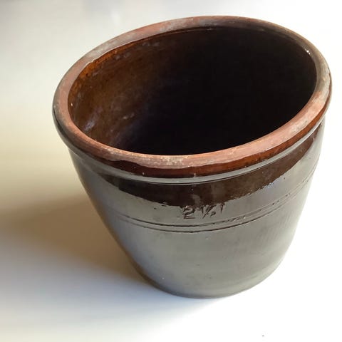 Gammel lysebrun lerkrukke. H 20cm Dia. 18cm.