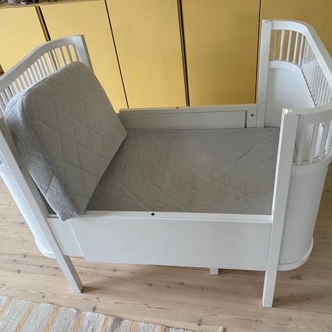 Brug til mine 2 drenge, men sælges nu, da de er for store. Kan trækkes ud i 3 forskellige længder og kan derfor bruges fra 0 år helt op til 4-5 års alderen, alt efter højde og vægt selvfølgelig. Der følger tremmer med til når sengen er trukket helt ind, madras samt ekstra madras til når sengen skal forlænges. Forlænges ved at skrue en skrue i i hver side i de henholdsvis 4 forskellige huller.