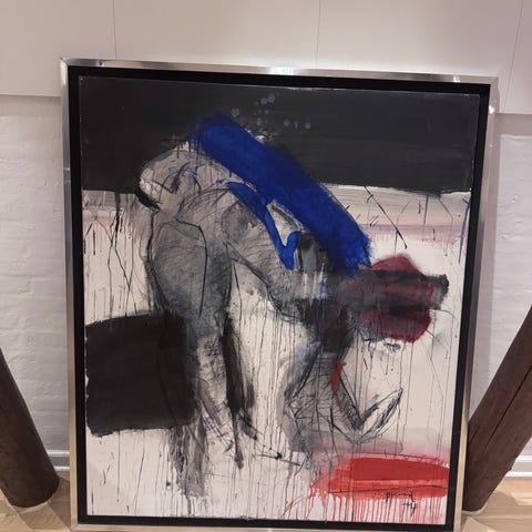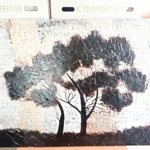 Maleri med motiv af to personer på bænk under regnvejr