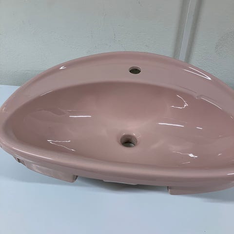 Oval vask i keramisk materiale med rød farve. Vasken har overløbs- og afløbshuller og er designet til installation i badeværelse eller lignende miljøer.