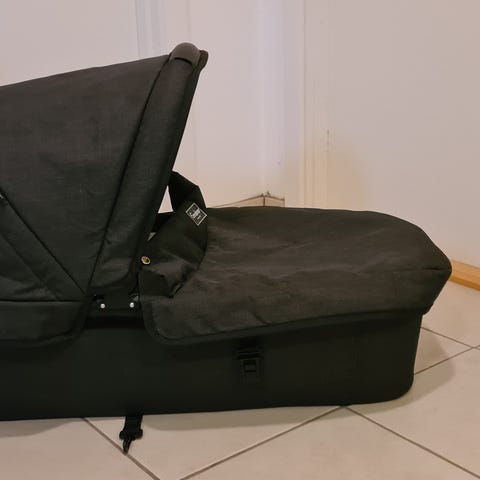 Emmaljunga Baby Lift 47000 babyseng i sort og hvid farve. Babysengen har en polstret inderside og bærehåndtag, samt en bund af træ med ventilationshuller. Produktet er designet til brug med Emmaljunga barnevogne.