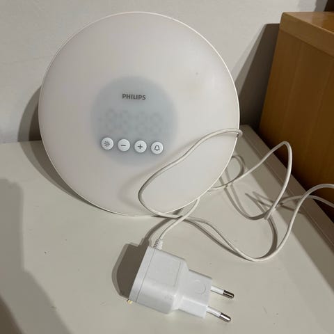 Sælger en Philips Wake-Up Light, model HF3480/01. Lampen vækker dig ved gradvist at øge lysstyrken inden vækketidspunktet, så opvågningen bliver mere behagelig end med en almindelig alarm.