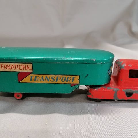 Tekno Transport Spedition lastbil model med tilhørende trailer. Modellen er udført i metal og plast med blå og hvide farver. Lastbilen har tekst på siderne med 'transport spedition' og er udstyret med seks hjul på lastbilen og seks hjul på traileren. Traileren kan trækkes af lastbilen og har åbent lastrum.