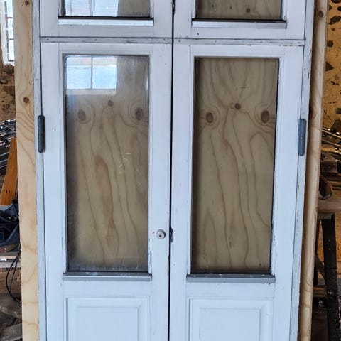 To-fløjet terrassedør i træprofil med fuldglas felter for optimalt lysindfald og åben forbindelse mellem inde- og uderum. Døren er udført i klassisk mørk træramme med synlige hængsler og greb. Konstruktionen består af et dobbeltdørsystem, hvor begge fløje kan åbnes efter behov, hvilket giver fleksibel adgang til terrasse, have eller andre udendørsarealer.