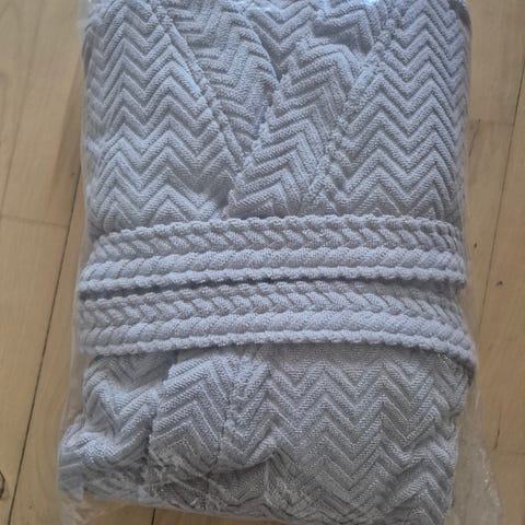 Sælger denne nye Georg Jensen Damask Herringbone badekåbe i blød frotté, I str Str. L/XL, længde: 118 cm, Skuldervidde: 62 cm, Brystomkreds: 126 cm, Ærmelængde: 59 cm