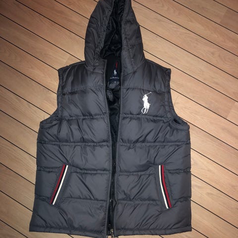 Ralph Lauren dunvest til herre i størrelse L. Vesten er blå og lavet af dun, hvilket giver isolering og varme. Velegnet til udendørs brug som et lag til ekstra varme.
