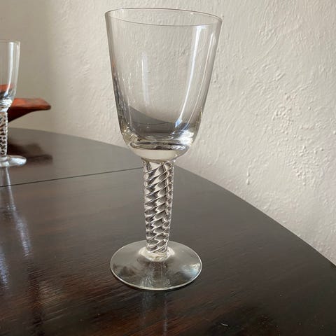 Glas, 5 hvidvin 2 rødvinsglas og 2 likør, Twist/Amagerglas Holmegård, 4 hvidvinsglas højde 14 cm og 1 højde 16 cm rødvinsglas højde 18 cm. Det ene rødvinsglas har et mini hak foroven. 2 likørglas højde 10 cm.