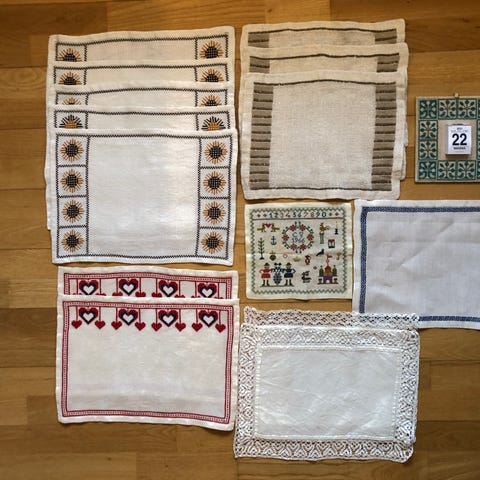 9 ikke monterede broderier fra Håndarbejdets Fremme årskalender 1973.