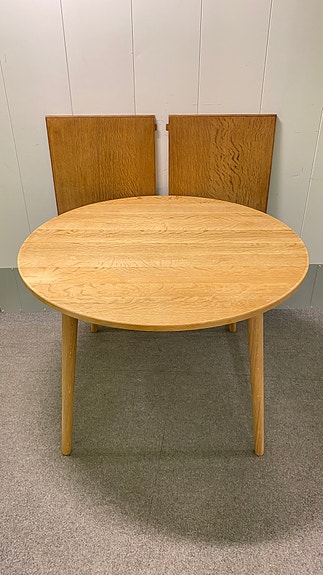 Kai Kristiansen. Lækker retro rundt spisebord i taek (malet) med udtræk, en tillægsplader. H. 72 cm. Tillægsplader 55 cm. Spisebord med plade totallængde 170 cm. Fremstår i ok stand. Evt kan lev aftales