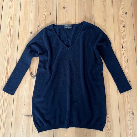 Dear Dharma Andet bluse til kvinder i størrelse S. Sweateren er blå og lavet af 100% ekstrafin merinould. Den har en polokrave og knaplukning foran.