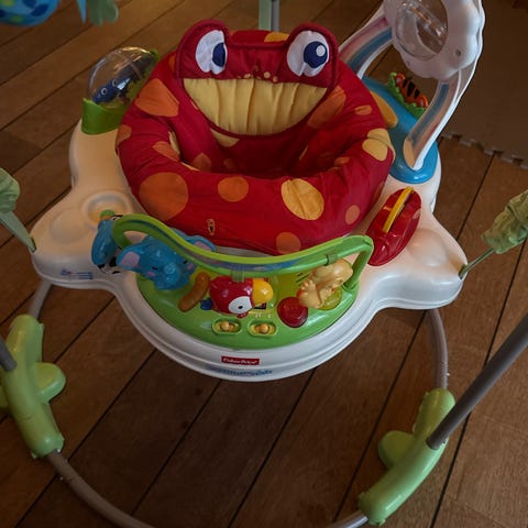 Skip Hop Hoppegyngestol med legetøj og lyd. Hoppegyngestolen har et sæde med høj rygstøtte og er udstyret med forskellige legetøjselementer som rangle, spejl og bideringe. Den indeholder over 20 stimulerende og udviklende legetøjsfunktioner, herunder lys og lyd, som aktiveres når barnet hopper. Hoppegyngestolen kan justeres i højden og er designet til at give barnet bevægelse og underholdning. Den kan foldes sammen for nem opbevaring.
