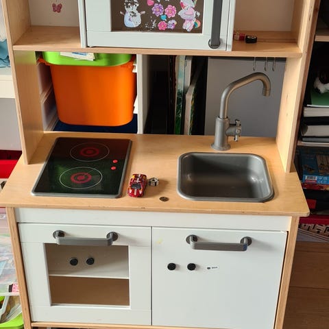 IKEA Duktig legekøkken . Kogepladerne fungerer dog ikke helt optimalt .
