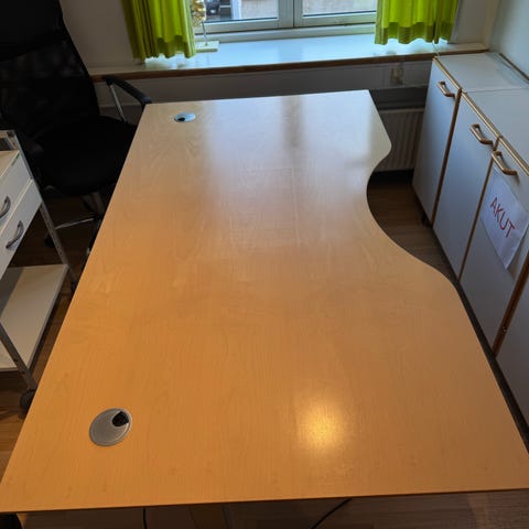 Skrivebord i ege træ med metalben. Bordplade i lyst træmateriale med en rektangulær form. Bordet har fire metalben med en buet konstruktion. Velegnet til kontor- eller arbejdsbrug.
