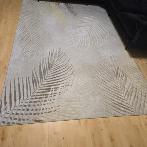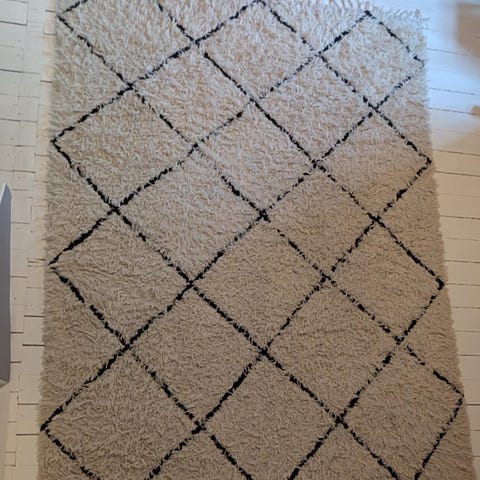 Rigtig fint gulvtæppe. Blankt. Mørkebrunt og syner næsten sort i noget lys. Blødt og har ikke nogle uheldige folder. Charmerende hvirvl på ‘rygrad’. To mindre huller (se billede). Hvis jeg selv skulle beholde det ville jeg duppe dem med farvet skocreme (kan hvirvl også) men det vil jeg lade ny ejer om. Priside 650.