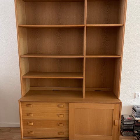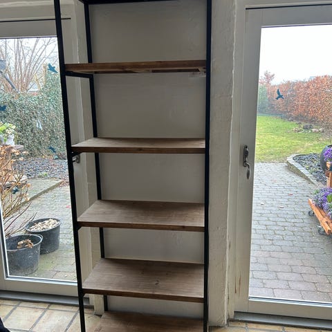 Antikbehandlet reol i egetræ med 5 hylder og flotte afrundede kanter.