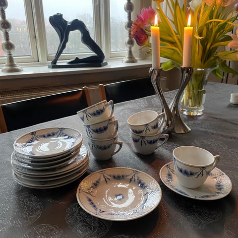 Fajance, Kaffestel, Empire bing og grøndal, Komplet stel til 12 personer med flødekande/sukkerskål.