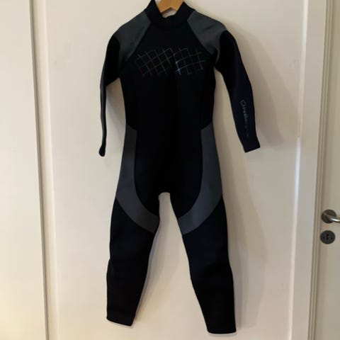 O'Neill Junior 3/4 AR våddragt i størrelse 150 cm, designet til børn. Våddragten er sort og grå og lavet af neopren materiale. Den dækker hele kroppen med undtagelse af hænder og fødder, og er velegnet til vandsport og aktiviteter i koldt vand.
