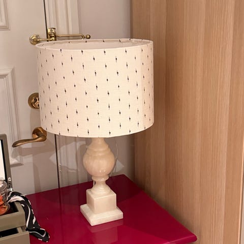 Lampeskærm, samt pudebetræk i det fineste drop fabric, med blå prikker. Lampeskærmen, kan bruges både som loftlampe og bordlampe, som set på billedet :-) Lampeskærmen måler ø30, højde 21. pudebetrækket måler 30x50, og lukkes med usynlig lynlås.