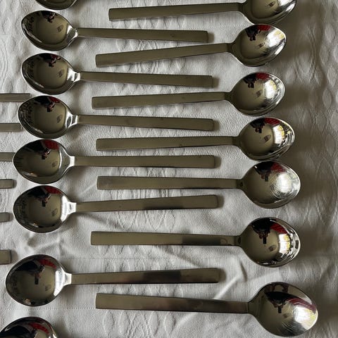 Raadvad bestik. Design Mads Odgård. 4 knive, 4 gafler, 5 skeer og 4 teskeer. Samlet pris