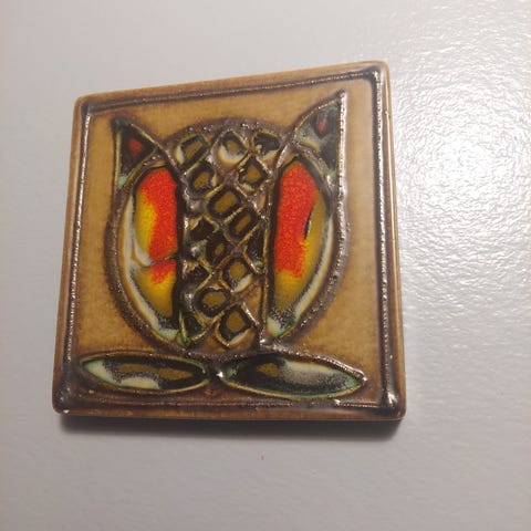 Berg Keramik vægflise med uglemotiv i keramisk materiale. Flisen har en firkantet form og er designet til ophængning på væg. Farverne inkluderer grøn, blå, brun og beige.