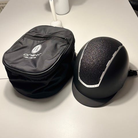 EquiPride Swing ridehjelm i sort med glimmer, størrelse 59. Med super fin opbevaringstaske fra One K med spejl og lommer. Det hele er i meget fin stand, ingen synlige brugsspor.