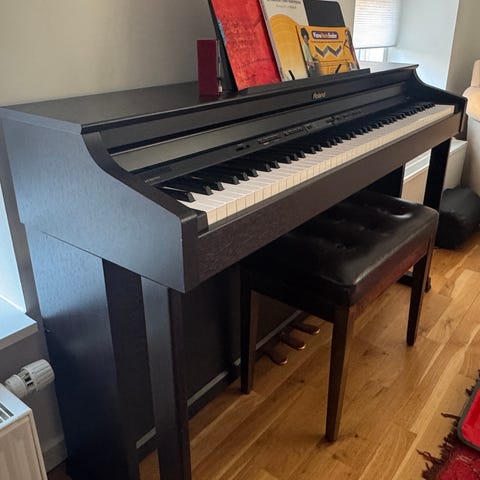 Roland EP-77 digitalt klaver med 88 tangenter. Sort farve med trædetaljer. Inkluderer hovedtelefoner, fodpedal og justerbar klaverstol. Designet til brug i hjemmet eller studie.