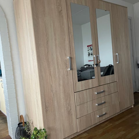 Skab med to spejle på midtersektionen, to skabe med håndtag i hver side samt tre skuffer i bunden. Skabet er fremstillet i lyst træ og har en funktionel opbevaringsløsning til tøj og andre genstande.