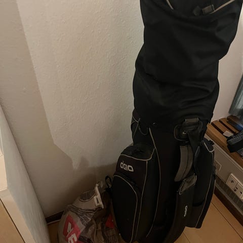 Golfbag med tilhørende golfkøller og headcovers. Golfbaggen er beige med brune detaljer og har flere lommer til opbevaring. Headcovers i sort og beige beskytter køllerne. Sættet indeholder forskellige typer golfkøller, der er velegnede som begyndersæt. Der kan evt medfølge en sammenklappelig vogn.