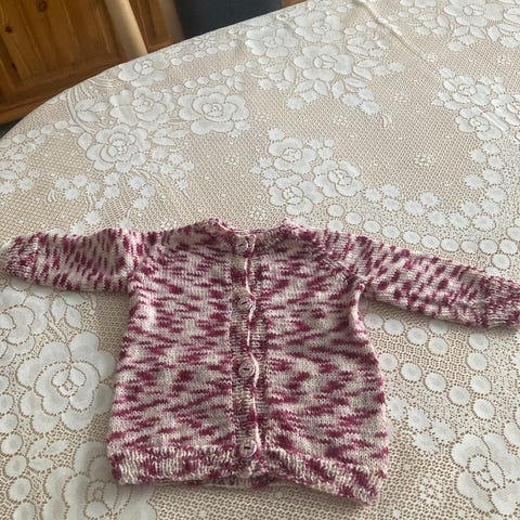 Hjemmestrikket, str. 56, Cardigan str. 3-6 mdr. strikket i acryl og uld