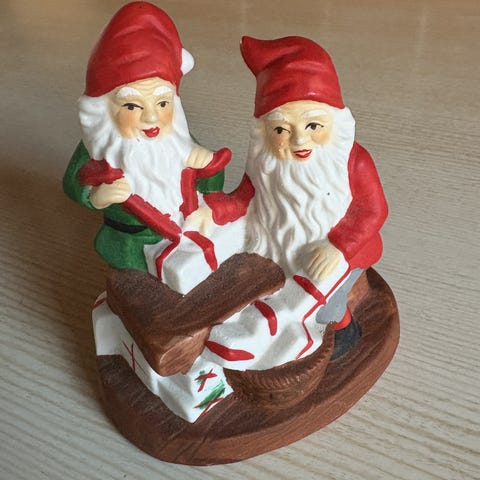 2 ældre nisser med juletræ og gaver. Måler ca 6 cm i højden. Sælges samlet.