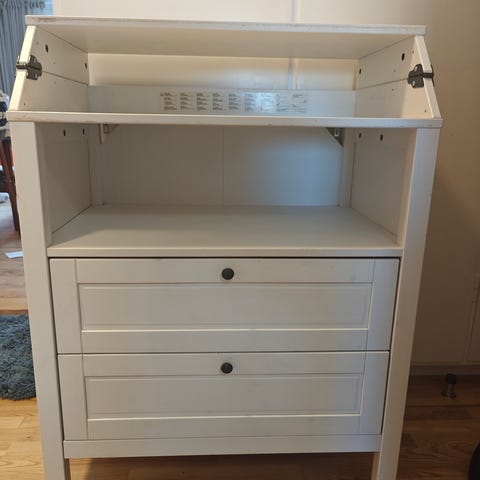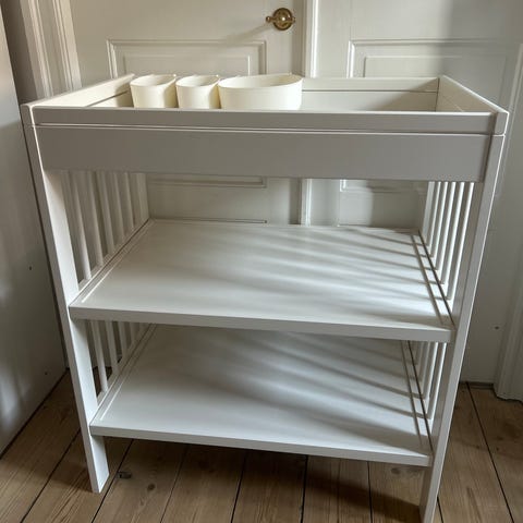 IKEA Skötbord med opbevaring i hvid farve. Indeholder flere skuffer og hylder til opbevaring af babyudstyr. Designet til at lette puslearbejdet med praktiske funktioner og god plads til nødvendigheder.