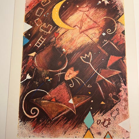 Signeret abstrakt litografi i ramme med farver i brune, røde, orange og turkise nuancer. Litografiet er indrammet