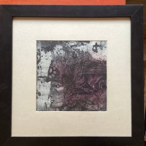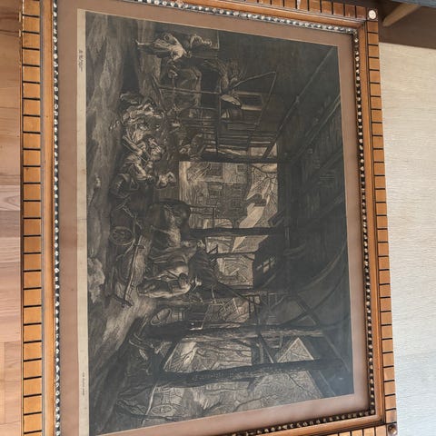 Kobberstik med motivet Stik Jean i ørkenen, baseret på et maleri af Raphael. Stikets tekst beskriver scenen og kunstnerens navn. Indrammet i en træramme.