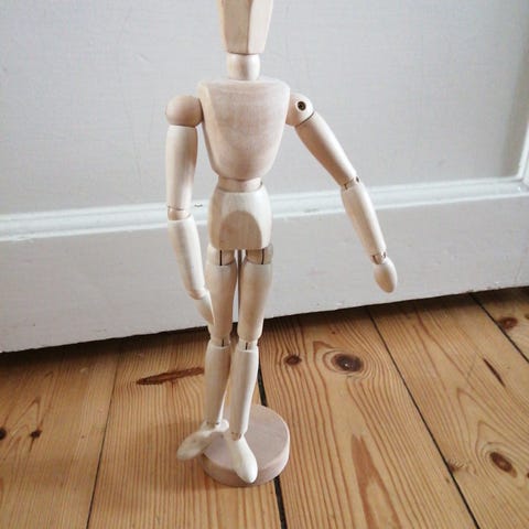 Sæt bestående af en bevægelig træfigur og en træhånd, begge velegnede til brug som modeller til tegning og kunstnerisk arbejde. Figuren og hånden kan justeres for at illustrere forskellige positurer og håndstillinger.