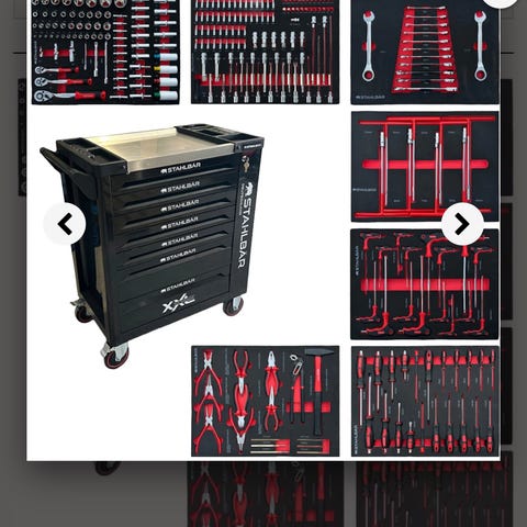 Brilliant Tools værkstedsvogn med integreret værktøjssæt. Værkstedsvognen er blå og sort og indeholder flere skuffer med forskellige typer håndværktøj, herunder skruetrækkere, nøgler, topnøgler og andre værktøjer. Værktøjssættet er organiseret i skuffer med skumindlæg for nem adgang og opbevaring.