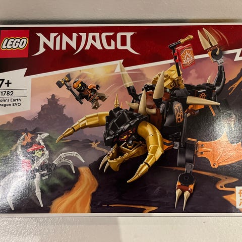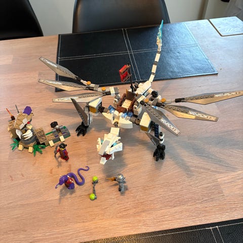 LEGO NINJAGO drage byggesæt med flere minifigurer. Sættet indeholder en stor drage i grønne og gyldne farver med bevægelige led og detaljerede elementer. Figurenes tema er baseret på NINJAGO universet.