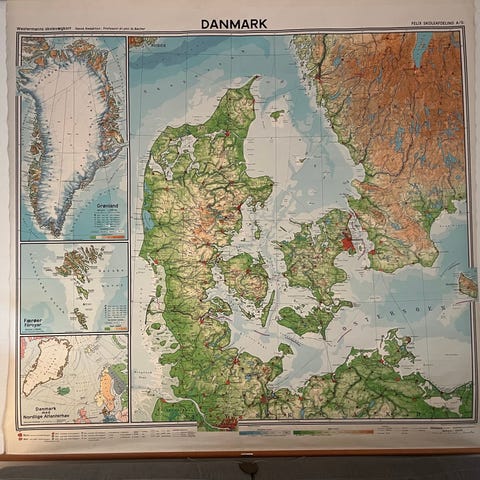 Gammelt skolekort over Danmark, Færøerne, Grønland 0g sydsverige