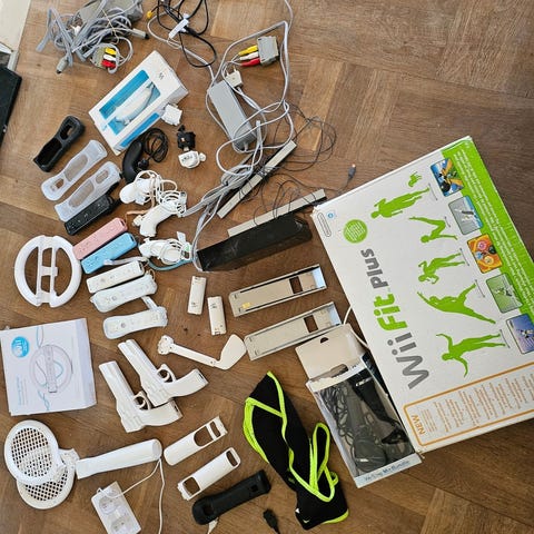 Nintendo Wii med strømforsyning, omformer, div. controlere, div. bats, balanceboard, træningsbælte, spil og brugsanvisning....alt på billederne kan købes og afhentes (eller sendes på købers ansvar) i 7830 Vinderup....tæt ved Herrup
