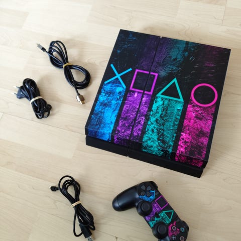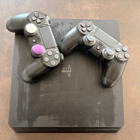 Sony Playstation 4 spillekonsol. Konsollen leveres med to trådløse controllere. Velegnet til afspilning af Playstation 4 spil.