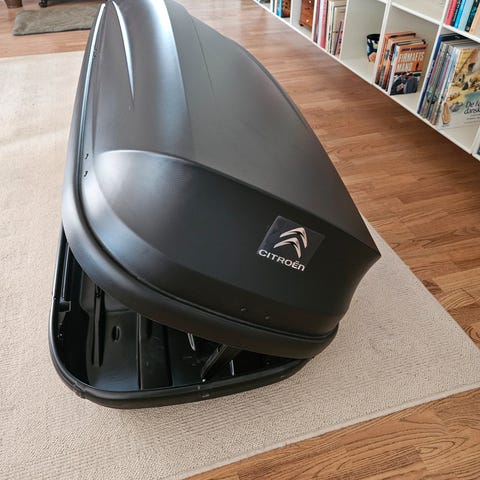 Tagboks og tagbøjler fra thuele brugt til en Citroen c5. Tagboksen er en 410l. Den er brugt 2 gange af 7-14 dages ferier. Den er købt hos Citroen Amager